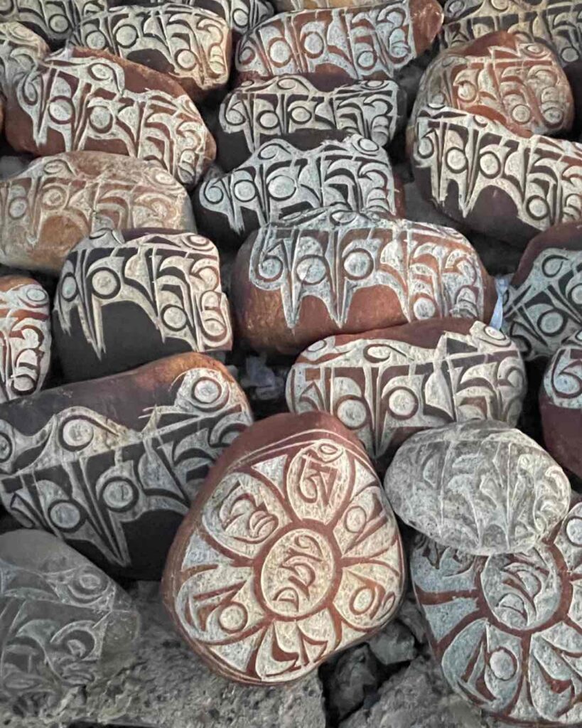 Į koros kelio pabaigą galima pastebėti graviruotų akmenų krūvas bei ištisas sienas — tai vadinamieji mani akmenys. Piligrimai viso kelio metu renka, neša arba deda mani akmenis kaip auką ir palaiminimą. Juose lotoso forma išgraviruota mantra „Om mani padme Hum”. Per vidurį „Om” – visų pradžių vibracija, dieviškos vienybės garsas. Likusi mantros dalis išgraviruojama aplinkui tarsi lotoso žiedlapiai.