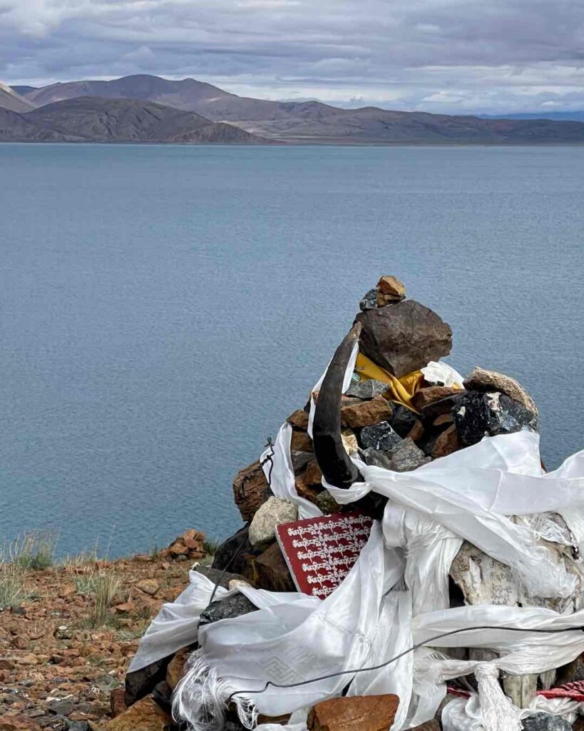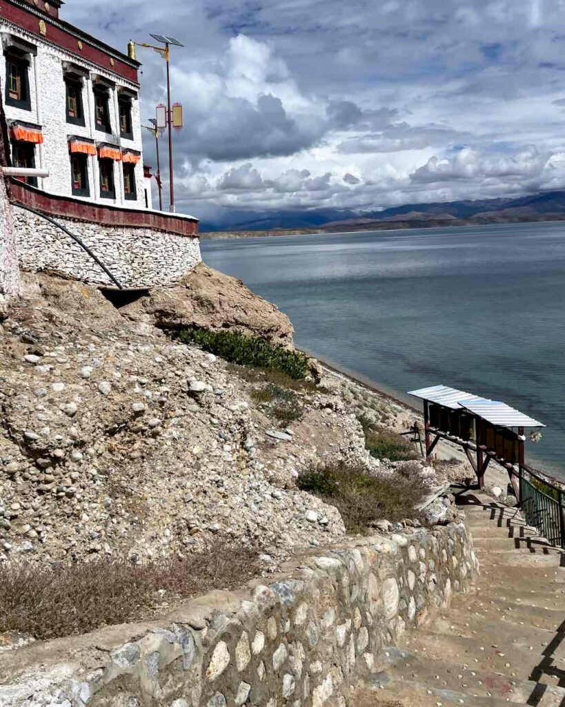 NUO Manasovaro gėlo, gyvo, švento ežero ( 4 583 m virš j.l.) vienoje pusėje IKI greta esančio Rakshastal sūraus, negyvo mirties ežero (4 575 m virš j.l..).