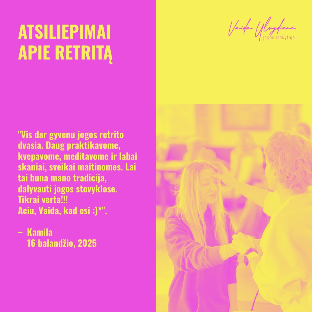Vis dar gyvenu jogos retrito dvasia. Daug praktikavome, kvepavome, meditavome ir labai skaniai, sveikai maitinomes. Lai tai buna mano tradicija, dalyvauti jogos stovyklose.